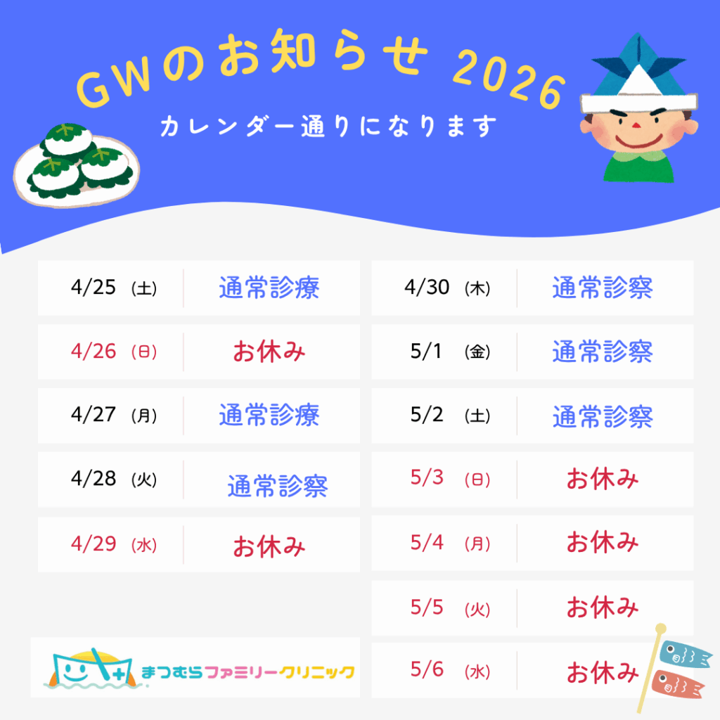 当日など、急遽決まる臨時休診・診療時間変更につきましては、クリニックからのお知らせページにてご案内します。お手数ですが、ご来院前にご確認いただけますようお願いします。